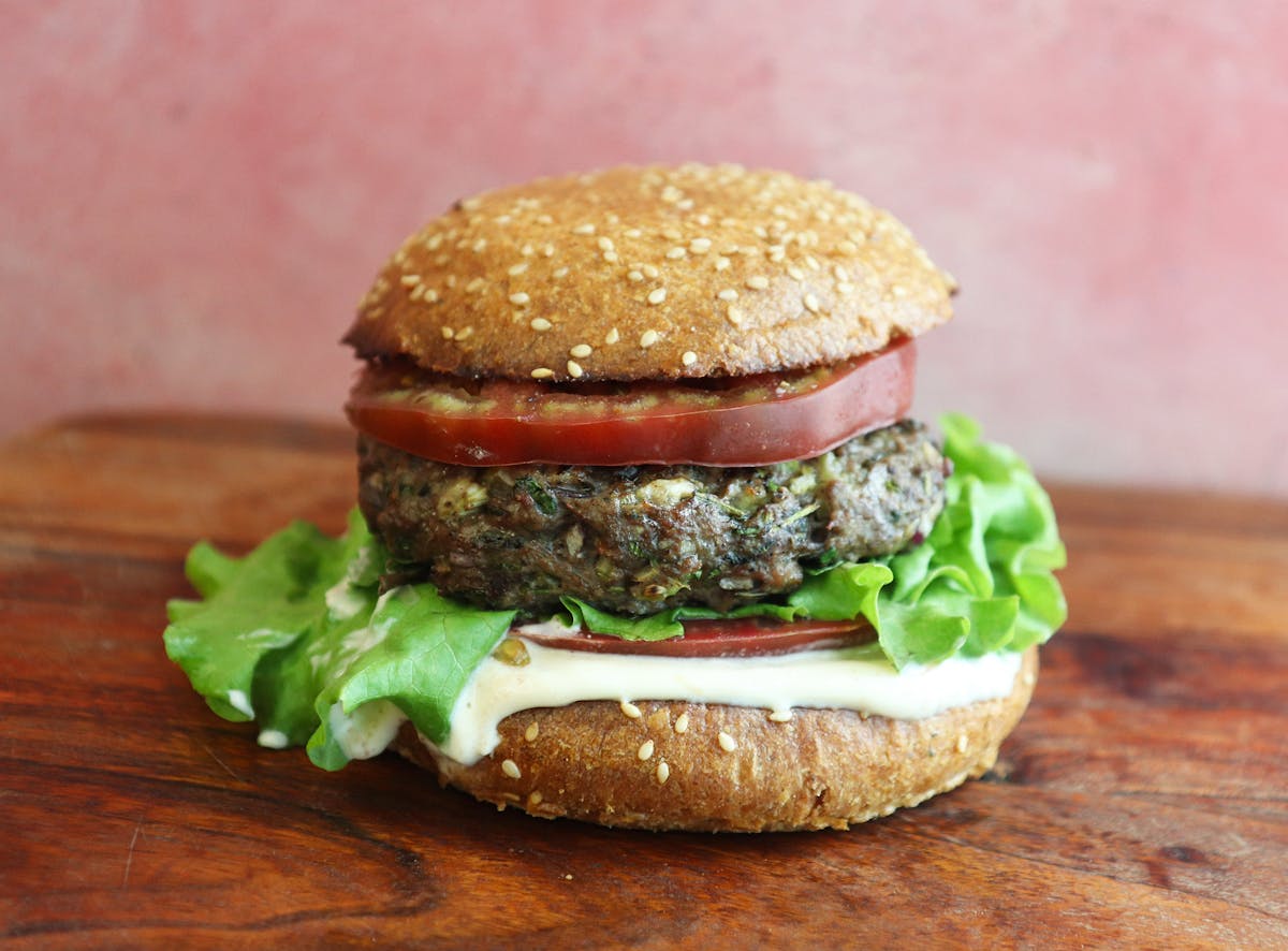 Today, when my mantra is less meat, but I do want to indulge in a burger, it’s usually made with ground lamb mixed with as many vegetables as possible while maintaining the integrity of the burger. The best part is – it tastes better than with just meat! Mushroom, celery, grated carrots, butternut squash, green beans, onions, ginger, herbs and more however it is important to mince the vegetables fine, so they not only blend but almost disappear into the meat while cooking. Use a food processor if you need to and if grinding the meat, do so with the vegetables. Many trials and errors later, we came up with a proportion of vegetables to meat ratio that worked best, which is how we serve it at the restaurant. 45 or nearly 50% of the mixture is vegetables and this not only makes the burger less ‘meaty’ and the vegetables add so much flavor. You can use any meat from chicken to beef to venison however they are best made with a meat which has a fat ratio of 20%. In this hot weather, outside grilling is the way to go so give it a try…you may never go back to making burgers without added vegetables!