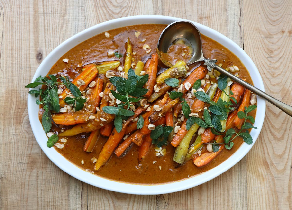 Maafe is one such West African peanut stew, usually made with a choice of meat, tomatoes, sweet potatoes and other vegetables. It is a delicious effortless balance of sweet, savory, earthy and spicy. The stew be greatly nuanced based on where it is made from Ghana to Nigeria however the one thing it has in common is that it always has peanuts as a base. You can use ground peanuts or just good natural peanut butter. Carrots, with their inherent sweetness are a great foil for the savory peanuts but feel free to add in other vegetables of your choice. Local carrots are in season now so try to get your hands on small multicolored carrots if you can!