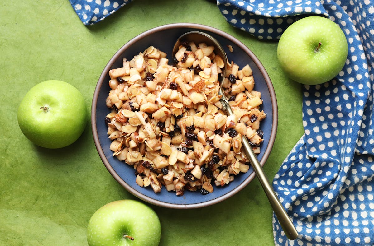 Passover, or the ‘pilgrimage of the passing over’, a major Jewish holiday is around the corner. The story of the exodus and liberation of Israelites from slavery and destruction in Egypt is recounted at the Passover Seder, a ritual feast celebrated worldwide with great pomp and ceremony by the Jewish diaspora. The Seder plate, which contains a variety of symbolic foods varies according to different traditions, but most Seder plates contain foods like boiled eggs, bitter herbs and lamb shank bones. A delicious condiment called Charoset (or Haroset), usually made with apples, walnuts and kosher wine is a fixture on the Seder plate and symbolizes the mortar used by Hebrew slaves to build Egyptian structures. I added a small pinch of red chile powder to give the condiment a little bit of a kick and it works well with the almonds and red wine. Give it a try, the charoset is wonderful added to a salad or eaten alongside roasted chicken or fish.