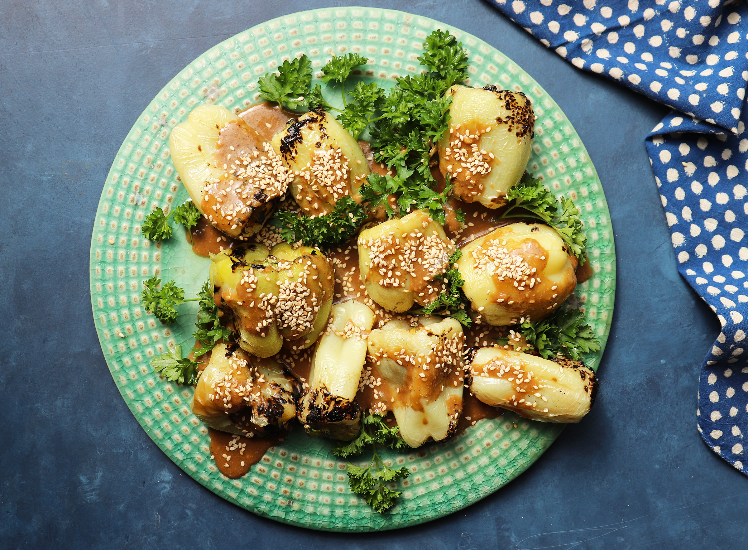 It’s not very often that I bring you a 5-minute recipe, but this is one of them. Sweet peppers bursting with flavor are in season right now and they don’t need much help. Flame them slightly over an open fire or broil them just enough to get some color then drizzle this quick sauce over and enjoy them warm or at room temperature. No need to peel them except removing the burnt parts, this way you get to ingest more of the fiber. Leftovers can be added to salads, rice or stir fries. Of course, you can amp them up by adding dollops of chevre or yogurt after you add the sauce.