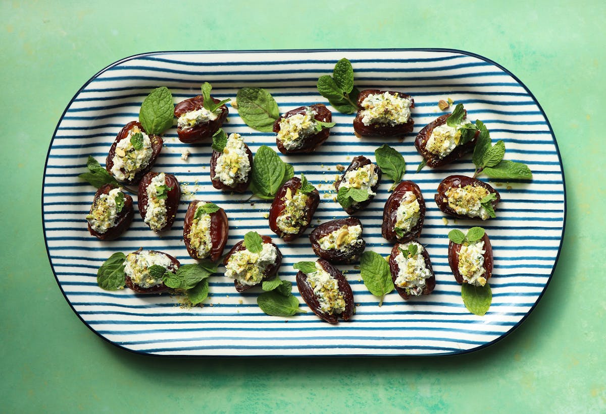 Here are dates stuffed with a savory mixture of chèvre with a touch of minced serrano pepper to bring up the heat and aromatic minced mint leaves. Pistachios add crunch. The coriander seeds and lemon juice add a lemony flavor. These dates will keep for 2 to 3 weeks in an airtight container in the refrigerator.
