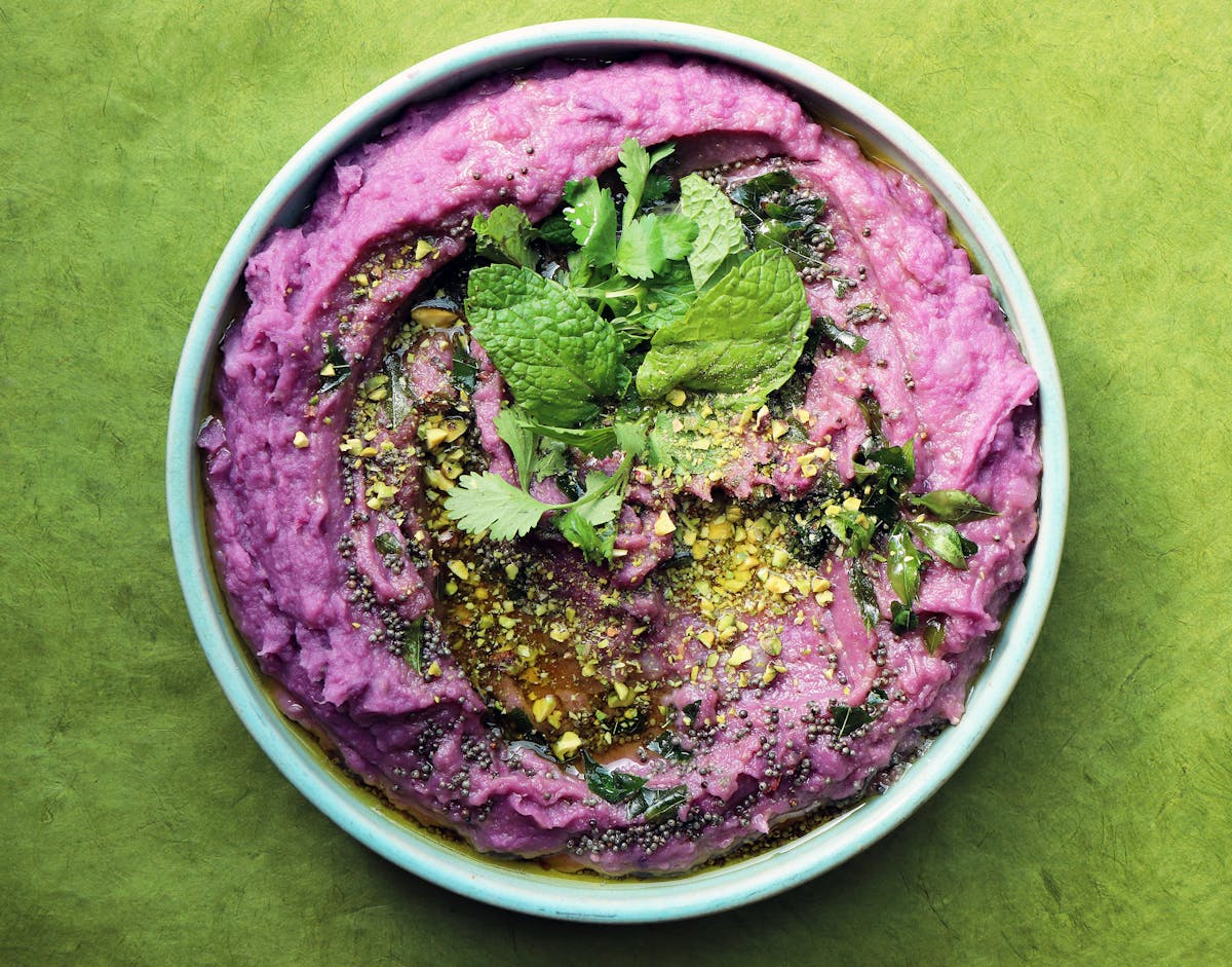 Here is a mashed potato recipe using the vibrant Japanese purple yam combined with the Idaho potatoes. The beauty of these potatoes is that they hold on to their brilliant purple color despite long cooking.