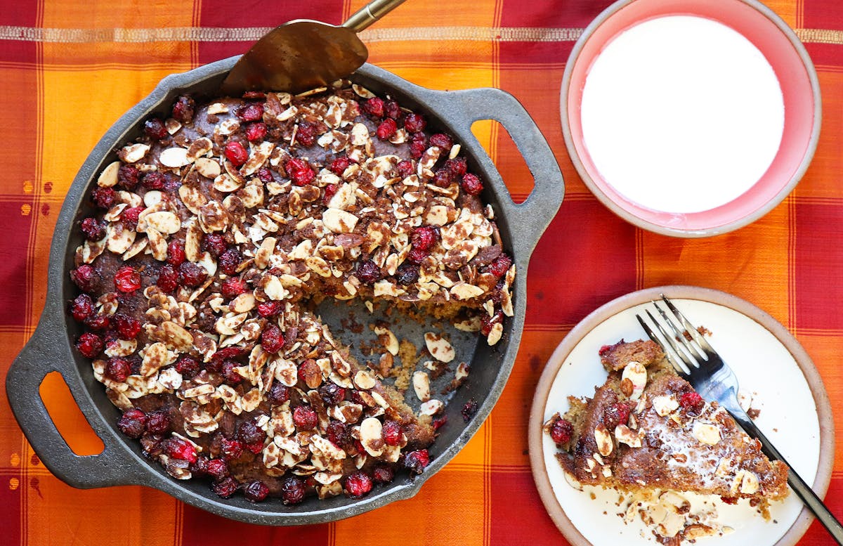 Given that a dozen or so spices weave through my day’s cooking, one always reigns supreme. Ginger, which I use in extremely copious amounts at the restaurant and my home, is hands down my favorite spice. Even the laziest iteration of my morning chai, when I just use a tea bag, will have sliced ginger in the cup steeping along with the tea. So, when our pastry chef, Taylor, one morning made a ginger cake, I was immediately infatuated with it. I also loved that it was an oil-based cake, as opposed to a butter-based cake simply because the oil ones remain moister over time. While she used a cream cheese frosting, I decided this is a cake I want sitting on my kitchen counter so I can enjoy it with that morning or afternoon cup of chai. I topped the cake off with cranberries; in keeping with the season but you can top it off with anything from blueberries to nothing at all and I promise you that it will make a wonderful snack or dessert.