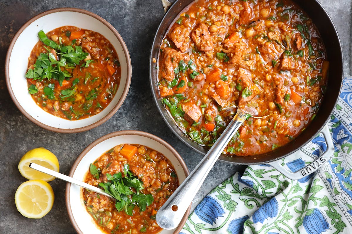 When my family and I first moved to Houston back in the nineties, a Moroccan family, with young children like ours, lived in a house down the street. We spent many evenings at their home enjoying traditional Moroccan foods like bastilla, tagines, all sorts of vegetable salads and couscous. Occasionally, we ate harira, a nutritious aromatic tomato-based meal-in-one-pot stew made with beans, vegetables and meat. A popular meal for iftar during Ramadan, harira is heartwarmingly delicious and can be easily adapted to what is available and like most meaty dishes, it tastes better the next day. Make it your way, meat or vegetable forward and finish with aromatics like cinnamon and parsley and just add more liquids to transform it into a soup. If using meat, pick meat with bones, which will add a lot of flavor. It is important to allow plenty of liquids to stay in the stew while cooking as all the elements from garbanzo beans to rice or vermicelli will absorb a considerable amount. To skip the meat entirely, make it with wild mushrooms like chantarelles, morels or maitake. Either way, this stew is a crowd pleaser and whether you celebrate Ramadan or not, you can enjoy harira during this wonderful spring weather.