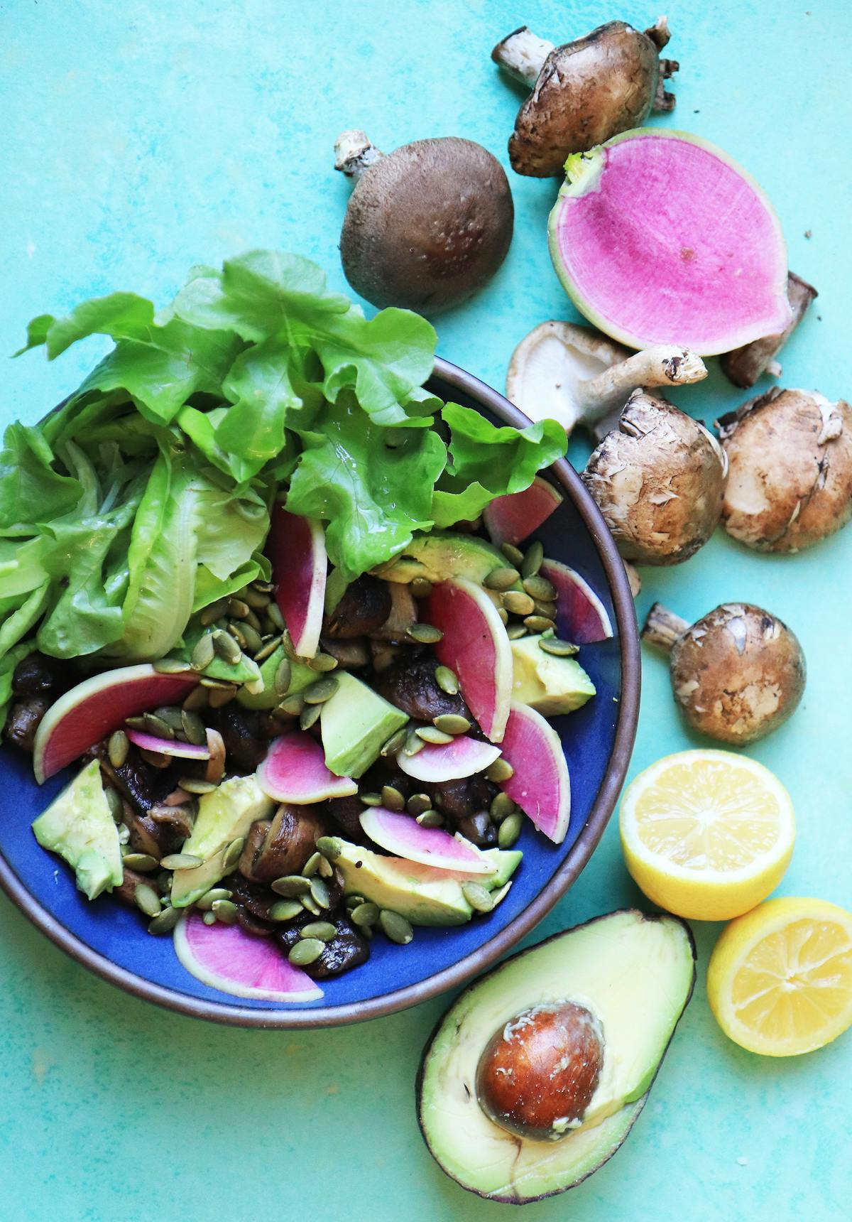 When I want something meatier for breakfast, I go for this mushroom salad. There are several mushroom vendors at the market who sell from oyster to shiitake to portobello mushrooms and I buy a weekly stash. On those mornings, I’ll rough chop a few mushrooms and cook them with a pinch of salt, cumin seeds and olive oil. On a cold day, I’ll add a minced serrano to help amp up my digestive fire. Alongside sliced radish and avocado, the mushrooms become a glorious breakfast. Maybe some lettuce leaves on the side, herbs, or microgreens. Satisfying and deeply flavorful yet light and nourishing.