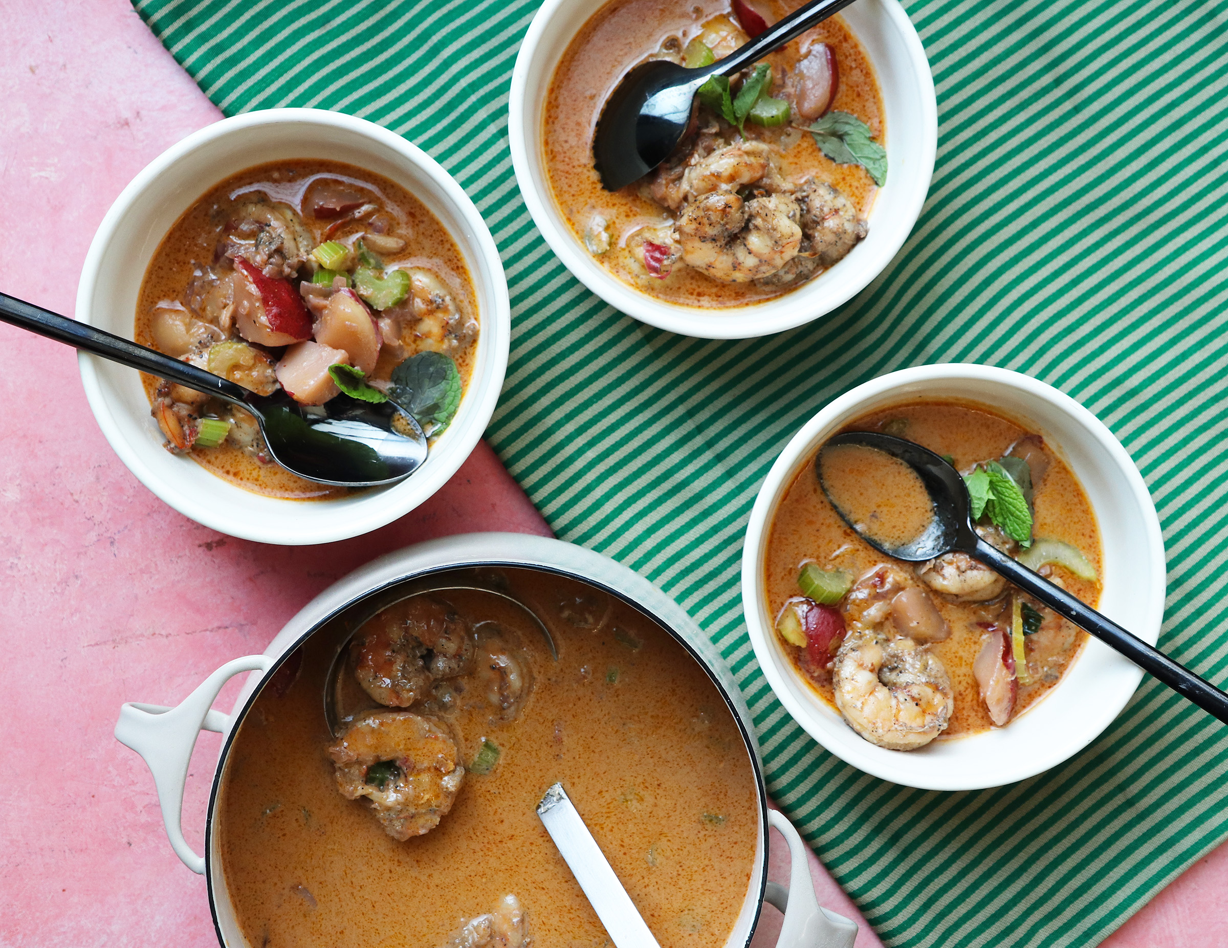 It is roselle season in Houston. Scientifically, it is known as Hibiscus sabdariffa. Last winter’s freeze killed the giant roselle bush in my backyard, however there are plenty of the fresh pretty red buds available at the Plant-It-Forward table stand at the weekend farmer’s market. The beauty of cooking with roselle is that unlike beets, which can turn brown with long periods of cooking, the color remains a vibrant pink for a long time. Given their citrus like flavor, I usually make a lemonade with roselle and added ginger. However, here I bring you a hearty shrimp soup made with the liquid extracted from the roselle. The tart flavor of the roselle pairs very nicely with sweet shrimp!