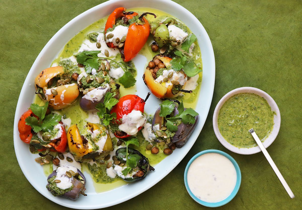 Judging from the farmstands at the weekend farmer’s market, peppers are in season galore. Purple and orange baby bells, big red and green bells and smaller green gypsy peppers are among the mix. These peppers are packed with depth and flavor not usually found in the supermarket variety so go ahead and make a trip to the local markets this weekend. As we await the fleeting colder weather, eating peppers, especially with spicy sauces is one way to keep us warm. Roasting then peeling peppers can be cumbersome so here is a simpler way to just slightly char them, then stuff and bake. Also, this way you get to enjoy the benefit of the pepper peel, which has plenty of fiber. These peppers are stuffed with garbanzo beans, but you just as easily stuff them with hummus or a different bean. To create a layer of flavors, the peppers are topped with yogurt as well as a green herb sauce. If you have leftovers, the next day just chop everything up and add it to scrambled eggs, rice or pasta. This way you can clear two meals with one dish!